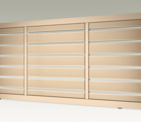 To σχέδιο είναι σύνθετο με οριζόντια και κάθετη διάταξη. Στο κάτω μέρος τα προφίλ είναι ραμποτέ 132 x 14mm σε οριζόντια διάταξη. Στο πάνω μέρος τα προφίλ είναι καρέ αλουμινίου 100 x 14mm σε κάθετη διάταξη με κενά.