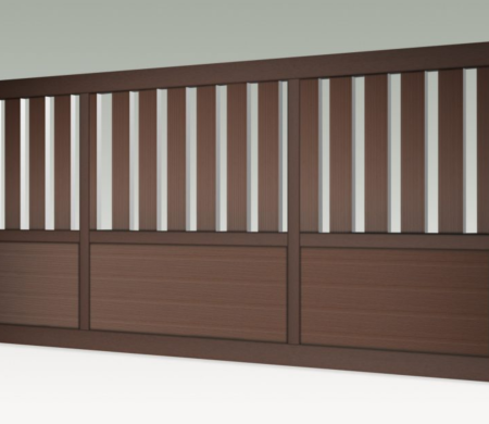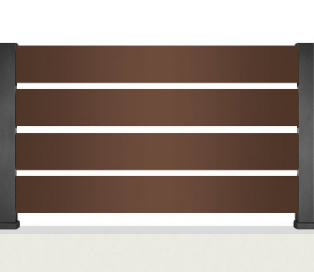 Οι κολώνες είναι σε χρώμα ΓΚΡΙ ΜΕΤΑΛΛΙΚΟ και έχουν διατομή 60x60mm. Τα οριζόντια στοιχεία είναι προφίλ 120x20mm σε χρώμα Καφέ μεταλλικό. Το προφιίλ είναι λείο χωρίς γραμμές σε νέα μίνιμαλ γραμμή. Τοποθετείται στην κολώνα χωρίς την χρήση αντάπτορα.