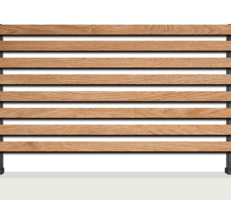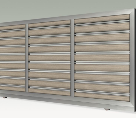 Οι κολώνες είναι σε χρώμα ΓΚΡΙ ΜΕΤΑΛΛΙΚΟ και έχουν διατομή 60x60mm. Ο σχεδιασμός τους επιτρέπει εξωτερική στήριξη. Τα οριζόντια στοιχεία είναι προφίλ 25x32mm επενδυμένα με pvc foil εξωτερικής χρήσης. H πιστή αποτύπωση της όψης του ξύλου χαρίζει υψηλή αισθητική αναλείωτη στον χρόνο. Η πυκνή διάταξη των προφίλ αποδίδει Minimal γραμμή, συμβατή με την σύνχρονη δόμηση.