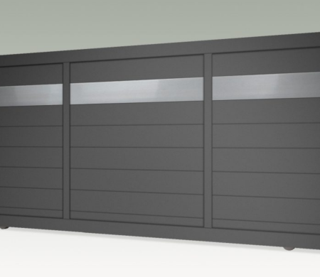 Το προφίλ του φύλλου και η κάσα είναι σε χρώμα ανοδίωση τύπου ΙΝΟΧ. Το σχέδιο είναι οριζόντιο με προφίλ 100x14mm. Το διακοσμητικό στοιχείο είναι ανοδιωμένο προφίλ 14x14mm.