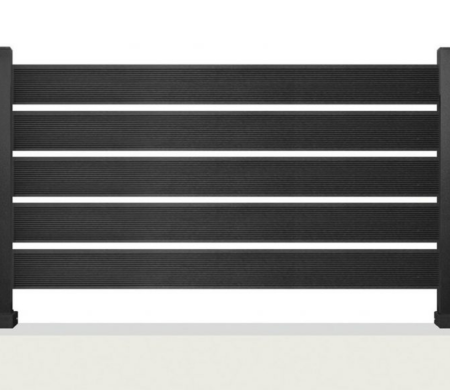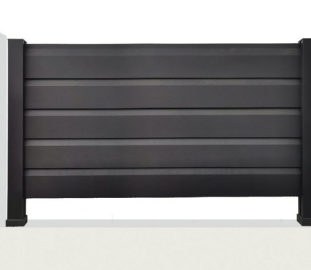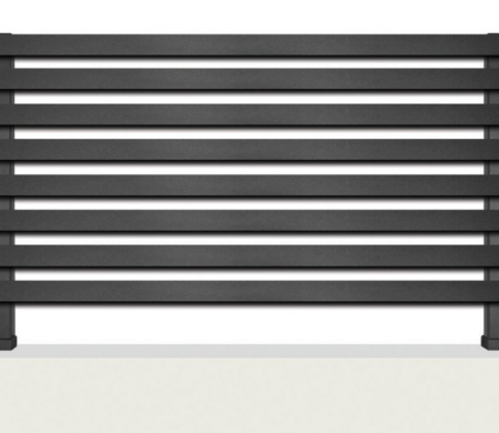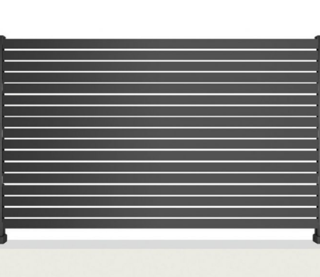 Οι κολώνες είναι σε χρώμα ΓΚΡΙ ΜΕΤΑΛΛΙΚΟ και έχουν διατομή 60x60mm. Τα οριζόντια στοιχεία είναι προφίλ 140x14mm στο ιδιο χρώμα. Eίναι σχεδιασμενο για να προσφερει ιδιωτικοτητα και παραλληλα να αφηνει διοδο στον αερα για μεγαλυτερη σταθεροτητα σε μεγαλυτερα υψη.